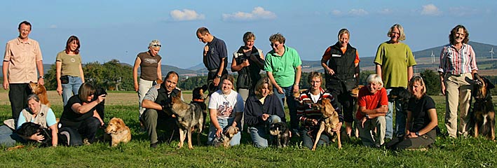 Um 9 Uhr trafen wir dann im Übungsgelände ein, wo das Intensivseminar mit Sozialisationsübungen begann, bei denen alle Hunde gleichzeitig auf dem Platz waren und zuerst einmal mit ihren Teamführern ausgiebig spielten. Dann wurde eine Gasse gebildet, die jeweils 2 Hundeführer mit ihren Hunden gleichzeitig durchlaufen mussten - möglichst, ohne dabei die Aufmerksamkeit ihres Hundes zu verlieren. Dann zeigten alle Teams gleichzeitig dicht nebeneinander verschiedene Einzelübungen aus der Team-Balance, um einen Überblick über ihren derzeitigen Trainingsstand zu geben. Den Abschluss dieser Vorübungen bildete eine gemeinsame Paradeübung aller 19 Teams. Es war ein tolles Bild, als alle Hunde in gespannter Aufmerksamkeit in einem Kreis lagen und auf das Auslösezeichen hin gleichzeitig zu ihren Teamführern spurteten. Schon diese kurzen Vorübungen machten Lust auf mehr.
