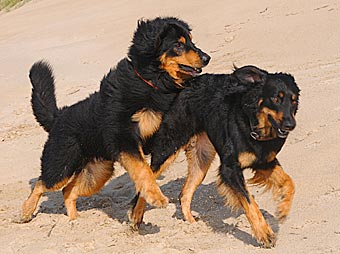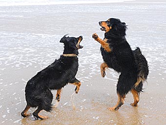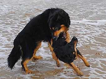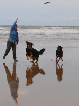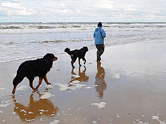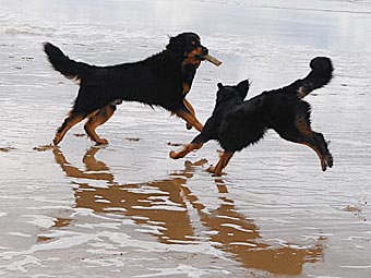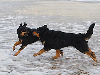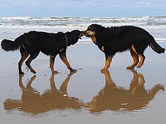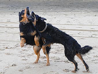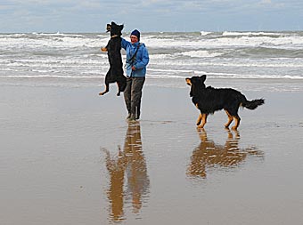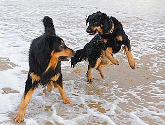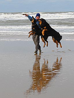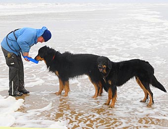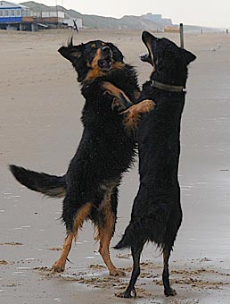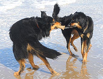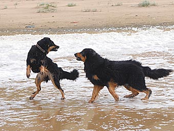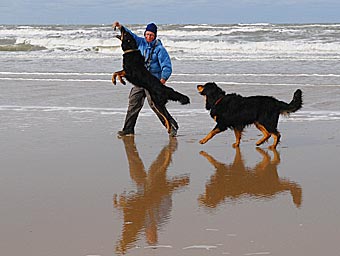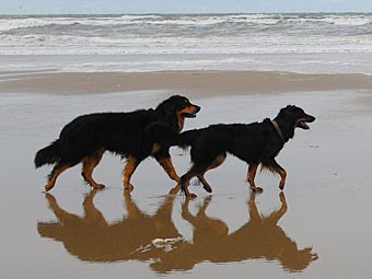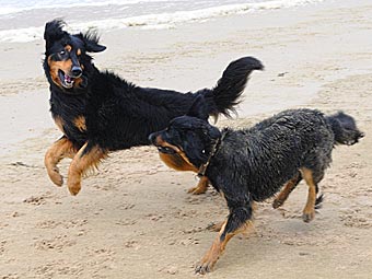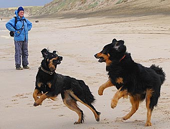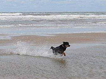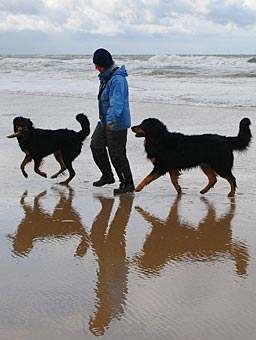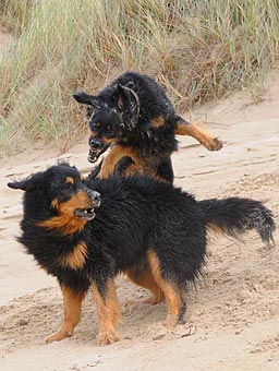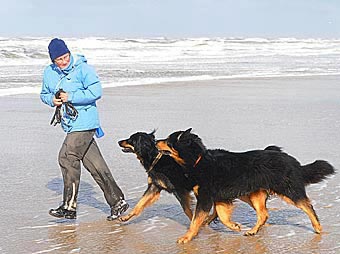 Gerade am Strand zeigt sich der große Unterschied zwischen Hovawarten und den meisten anderen Hunden, die den Strand bevölkern. Das Spiel unserer Hovis war viel temperamentvoller und rauher. Wir mussten ständig darauf achten, dass wir genug Abstand zu den anderen 'Strandläufern' haben, denn unsere Rabauken brauchten viel Platz. Die Power, die 2 Hovis zusammen entwickeln ist enorm. Es wäre unmöglich gewesen, die großen Hunde einfach zwischen den vielen Menschen toben zu lassen - da wären ein paar derbe Rempler sicher nicht ausgeblieben. Deshalb musste Argus in der Nähe des Strandzugangs erst mal an der Leine bleiben. Erst wenn der Strand etwas einsamer wurde, konnten wir den Hunden freien Lauf lassen. Aber dann sah man ihnen ihre Lebensfreude und ihren Übermut richtig an. Mir fielen immer wieder Strandbesucher auf, die ihren Spaziergang unterbrachen und fasziniert stehen blieben, um dem ausgelassenen Spiel unseres Dream Teams zuzuschauen und dann lächelnd weiter zu gehen.