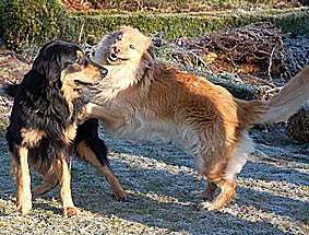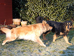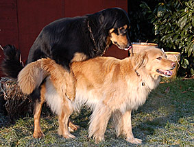 Es war bereits die dritte Läufigkeit, bei der die Züchter versuchten, von ihrer Hündin Welpen zu bekommen. Die Hündin ließ sich kaum decken. Der erste Rüde konnte den Deckakt nicht vollziehen. Der zweite Rüde war zwar "erfolgreich", es gab aber keine Welpen. Auch Helos bemühte sich 3 Tage lang um diese Hündin, drang auch immer wieder ein, die Hunde verknoteten aber nicht. Erst am 3. Tag kam es nach mehreren erfolglosen Anläufen endlich zum ersehnten Hängen. - Trotzdem blieb der erwartete Kindersegen aus.