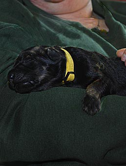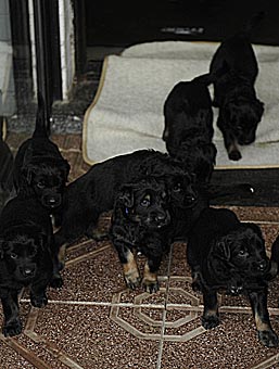 Im Alter von 8 Wochen bildet sich das Gruppenverhalten heraus. Die Welpen beginnen, erste Anfänge einer Rangordnung zu entwickeln. Nun zeigt sich, wer dazu neigt sich zu wehren, ernsthaft zu kämpfen oder klein beizugeben. Nun kommt unsere Tierärztin, um die Welpen zu impfen, mit einem Chip zu versehen und Blut für die DNA Datenbank des RZV abzunehmen. Bei der Gelegenheit werden die Welpen von ihr auch gleich einem kleinen Gesundheitscheck unterzogen. Wir geben die Welpen im Laufe der 9. Woche ab, da sie in diesem Alter einerseits noch viel von ihrer Mutter lernen, andererseits aber auch bald die Förderung ihrer neuen Familie brauchen. |