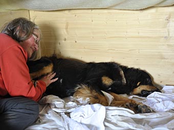 Unsere erwachsenen Hunde leben selbstverständlich zusammen mit uns im Haus und sind immer da zu finden, wo auch wir sind. Wir streicheln unsere Hündin während der Tragzeit ganz besonders oft, Carla genießt das sehr und die Welpen nehmen diese Streicheleinheiten durch den Mutterbauch hindurch wahr. Welpen von Müttern, die während der Tragzeit viel gestreichelt wurden und in einem entspannten Umfeld leben, können selbst auch entspannter mit kritischen Situationen umgehen und sind allgemein ausgeglichener und gutmütiger, was sich auch auf eine bessere Bindung zum späteren Besitzer auswirken kann. Geboren werden die Welpen in unserer Essecke, die direkt an Küche und Wohnzimmer grenzt. In der allerersten Zeit schlafe ich direkt neben der Wurkiste, um im Notfall immer sofort bereit zu sein. |
