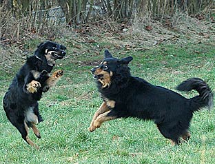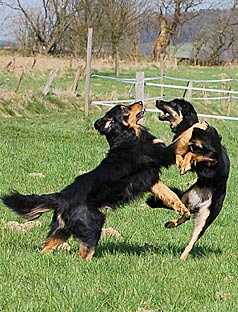 Erst seit Carla 6 Monate alt ist, gehe ich ab und zu mit beiden Hunden gemeinsam gassi. Vorher bin ich immer nur mit jedem Hund einzeln gegangen, damit keiner zu kurz kommt. Das war zwar extrem zeitaufwändig, aber ich hatte den Eindruck, dass beide Hunde die Einzelzuwendung brauchen. Die Ansprüche eines Welpen und eines erwachsenen Hundes sind einfach zu verschieden. Zu Carla konnte ich so eine sehr gute Bindung aufbauen und gleichzeitig verhindern, dass sie bei Tobereien mit dem großen Rüden überlastet wird. Gerade beim Spielen mit Artgenossen werden die Gelenke durch die schnellen Stopps und Wendungen stark belastet. Gleichzeitig ist meist noch kein ausreichender Muskelapparat vorhanden, der die Gelenke schützt. Ein gesundes Hüftgelenk wird durch die normale Bewegung und durch Spielen mit Artgenossen zwar nicht geschädigt, eine massive Überbeanspruchung des noch unreifen Skeletts des Junghundes sollte jedoch vermieden werden. Ein Knochen im Wachstum ist weniger belastbar als das Skelett eines ausgewachsenen Hundes. Achten Sie deshalb immer darauf, wann ihr Junghund erste Anzeichen von Ermüdung zeigt und nehmen Sie ihn dann sofort aus dem Spiel heraus.