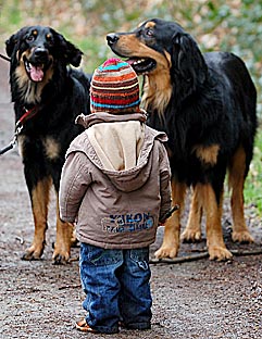 Hovawarte sind Hunde mit Ecken und Kanten. Deshalb ist es bei jungen Hovis besonders wichtig, die Verträglichkeit gegenüber Artgenossen zu fördern. Laden Sie z.B. immer wieder freundliche Hunde ein, um im Haus und Garten mit dem Jungspund zu spielen. Ermöglichen sie ihm Kontakte zu souveränen Hunden, die dem überdrehten Hovi-Rüpel auch schon mal in die Spur helfen. Wird er zu grob, verordnen Sie ihm eine Auszeit und nehmen sie ihn evtl. kurzfristig an die Leine. Lassen sie ihn erst wieder zu den anderen Hunden, wenn er sich beruhigt hat. Trainieren Sie auch möglichst bald ein Abbruch-Wort (evtl. mit Hilfe einer Schleppleine), damit sie ihn rechtzeitig abrufen können und belohnen Sie ihn fürstlich, wenn er kommt. Hören Sie aber auf keinen Fall auf andere Hundehalter, die die Hunde einfach nur gewähren lassen wollen, so nach dem Motto: "Das machen die unter sich aus!"