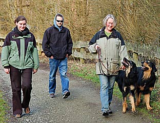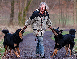 Meistens laufen beide Hunde frei. Wenn die Situation es erfordert, verlange ich aber, dass beide Hunde an durchhängender Leine 'bei Fuß' gehen. Entweder ganz oder garnicht. Sind sie frei, laufen beide Hunde um mich herum, ohne die Distanz allzu groß werden zu lassen. Sie sind offensichtlich beide bestrebt, es mir recht zu machen und suchen immer wieder den Kontakt zu mir, was ich natürlich auch entsprechend honoriere. Es ist ein schönes Gefühl, Teil eines gemischten Mensch-Hund-Rudels zu sein.